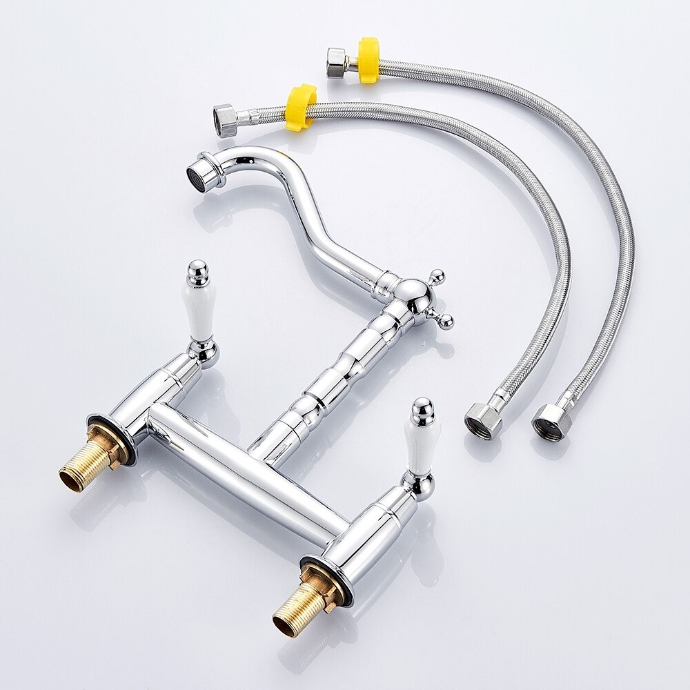 Deze brug kraan retro stijl dubbel handvat keramische keuken mengkraan wordt geleverd met alle onderdelen om te starten: de nodige montagehardware en slangen voor warm en koud water zitten erbij. Het op het dek gemonteerde systeem maakt de installatie overzichtelijk; met basisgereedschap en de meegeleverde handleiding kom je er vlot doorheen. De kraan is eenvoudig te onderhouden: veeg na gebruik even droog, en neem hem wekelijks af om kalk en vlekjes te voorkomen. De stevige messing basis en de keramische plaat zorgen voor een lange levensduur en blijven prettig werken, ook bij dagelijks gebruik. De uitrekbare uitloop en het roterende deel zijn ontworpen om soepel te blijven bewegen. Zo houd je controle zonder kracht. De kraan is leverbaar in chroom. Daarmee past hij goed bij veel spoelbakken, grepen en apparaten. Wie zoekt naar een solide, mooi afgewerkte kraan met een retro uitstraling en moderne bediening, vindt in dit model een fijne partner aan het aanrecht. De mix van strak sturen, eenvoudig schoonmaken en nette montage maakt het geheel compleet.