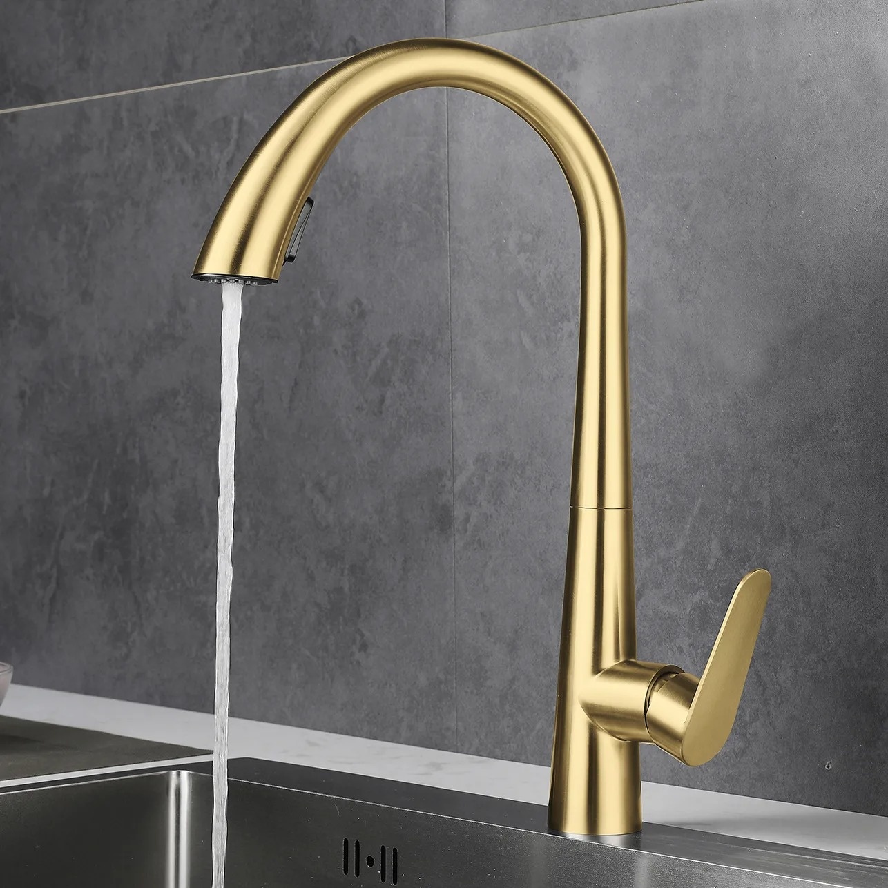 • Shop nu deze Modern hoog gebogen pull down keuken mengkraan met 2 functies geborsteld goud op Valisa.nl